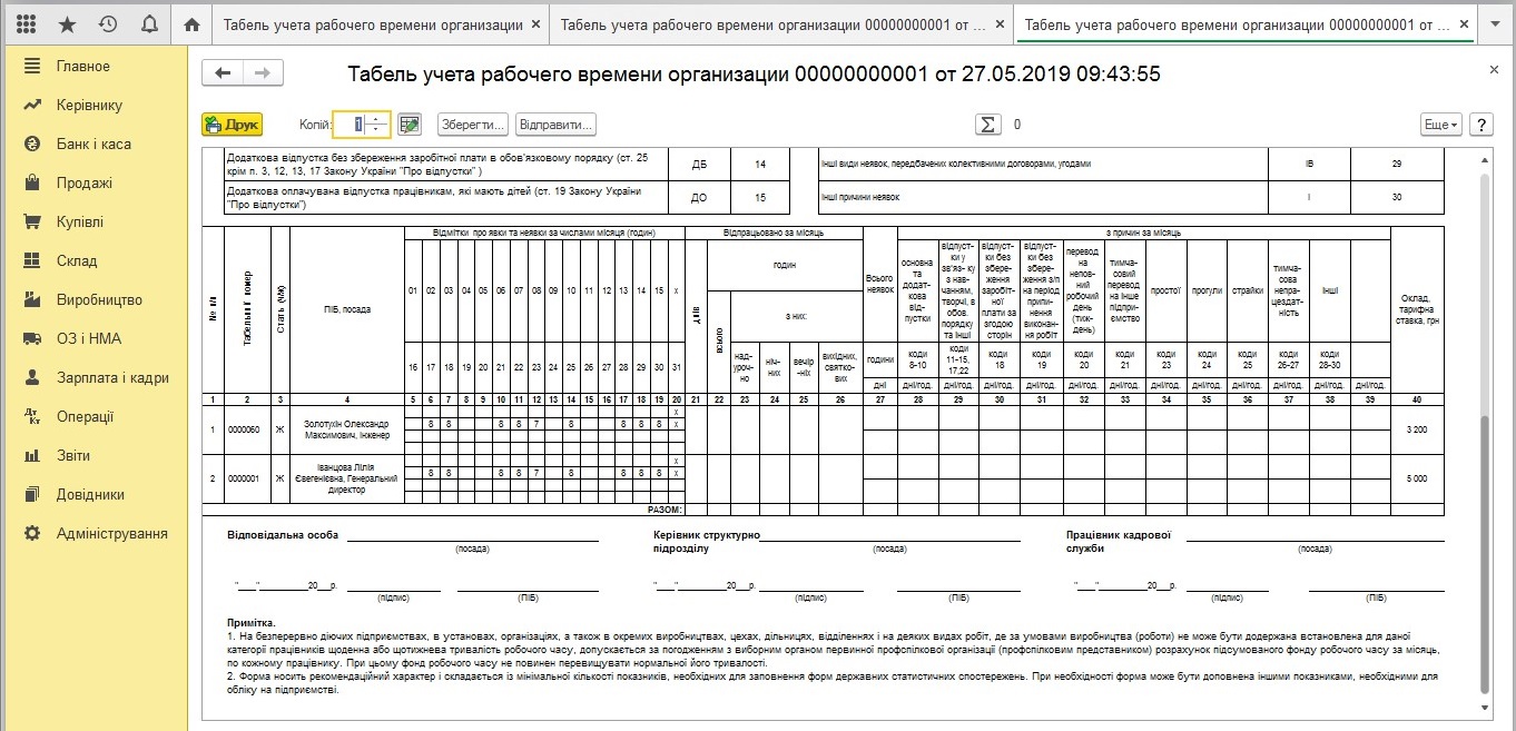 Друкована форма «Табель обліку використання робочого часу»